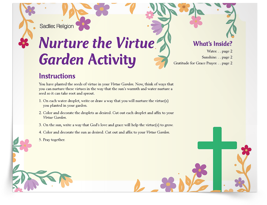 Invite kids and families to reflect on the ways that virtues are nurtured as part of Catholic family life. The Virtue Garden Activity encourages families to nurture virtues like patience and generosity as part of everyday faith life. Using creative, hands-on garden activities, families “plant” and “grow” virtues over time with printable elements, representing how our choices help us grow closer to God and how virtues can blossom with care.