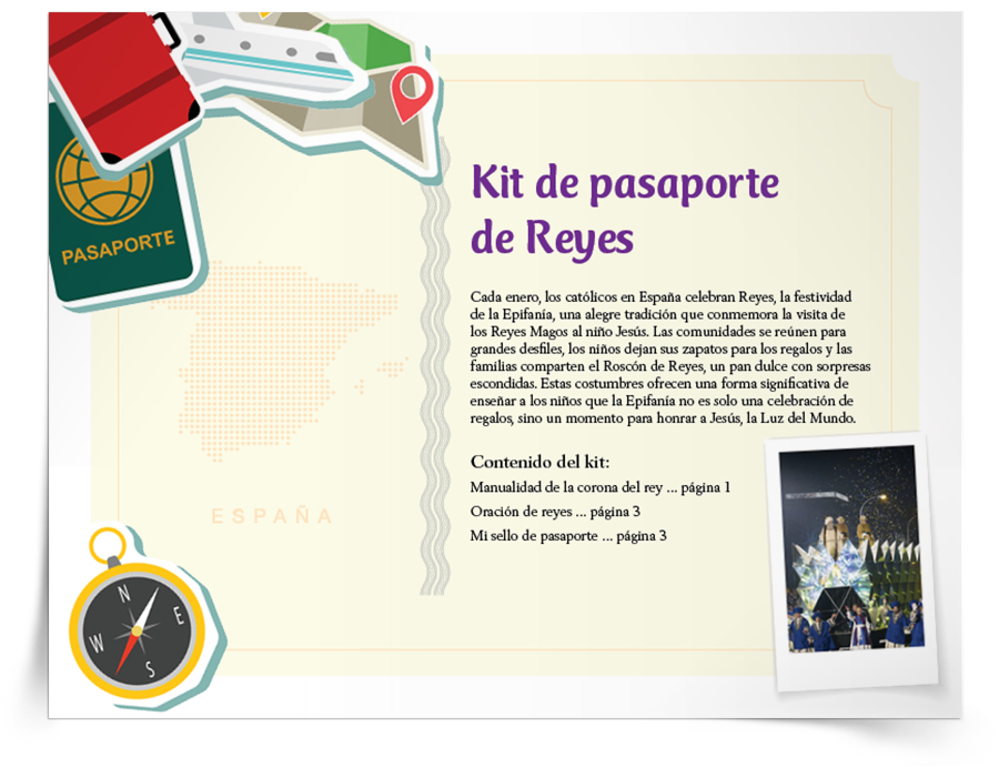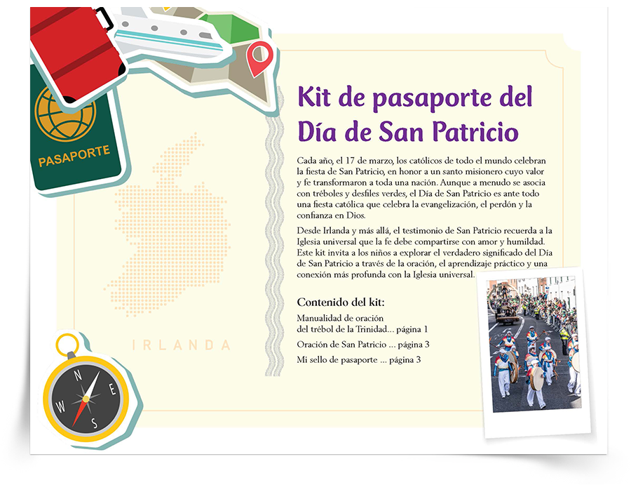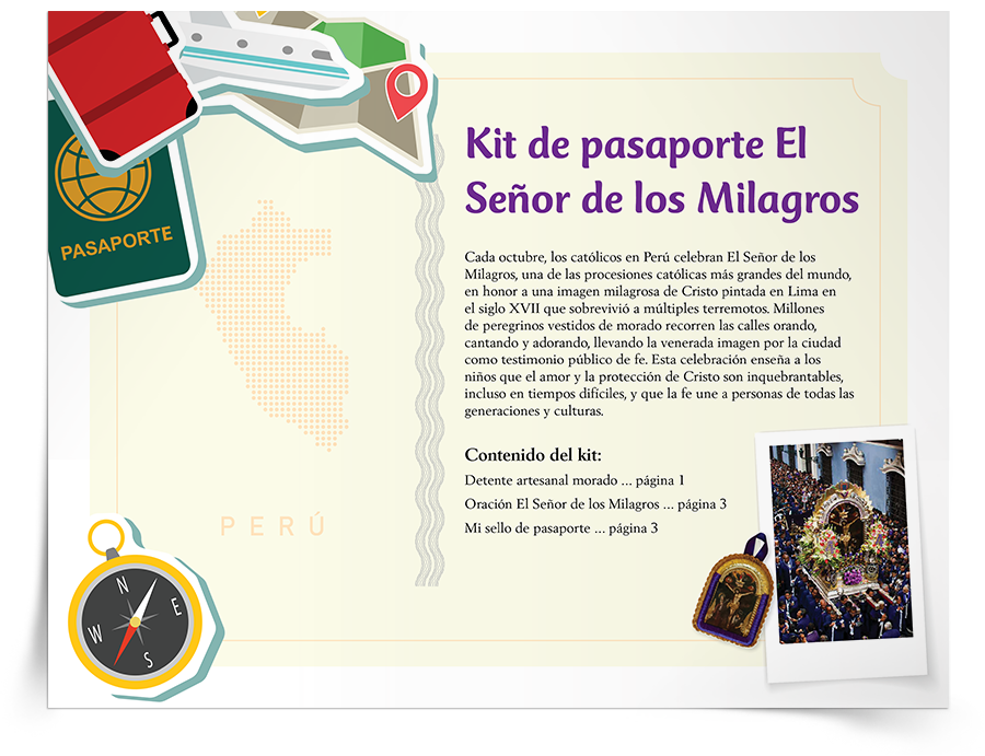Vive las celebraciones católicas de todo el mundo desde casa o desde la escuela. Nuestra fe católica se celebra en todos los continentes, idiomas y culturas. Cada mes, emprende un viaje virtual de fe para descubrir cómo las comunidades católicas de todo el mundo celebran las fiestas, los santos y las tradiciones sagradas que nos unen como una sola Iglesia. Descarga y personaliza tu pasaporte imprimible gratuito en la Actividad Mi Pasaporte Católico, y luego «viaja» por el mundo con el blog de religión Sadlier, coleccionando y pegando un sello de pasaporte y una oración para cada celebración destacada en el kit de pasaporte mensual. En cada kit, los niños y las familias católicas pueden explorar la riqueza de las celebraciones mundiales de la Iglesia a través de historias, manualidades, recetas y reflexiones.