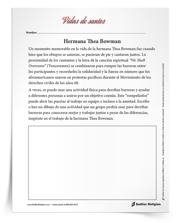 Descargar ahora Download NowDescubre la vida de la hermana Thea Bowman, una religiosa católica negra llena de alegría y fe, con una actividad que anima a los alumnos de 3.º a 8.º curso a reflexionar sobre su mensaje de unidad y valiente seguimiento de Jesús.