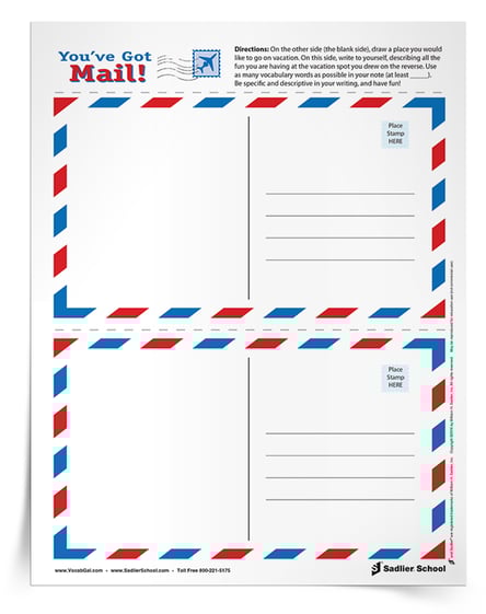 Once the students’ summer vocabulary postcards are complete, they should address the postcard to themselves. You can mail the postcards off a few weeks after summer vacation begins, or you can hand them back to your students at the beginning of the next school year, to refresh their memories of the words they learned the previous year.