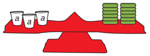 To find the value of a variable in an equation such as 3a = 6 + 6, have students place three small plastic cups, each labeled a, on the left side of a balance scale, and 2 stacks of 6 counters each on the right side.
