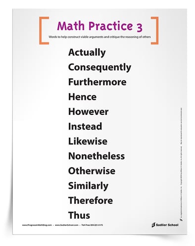 Focusing on vocabulary development will help students to construct viable arguments and critique the reasoning of others. To help you implement this in your classroom, download the poster of the conjunctive adverbs so students can refer to them as they learn to use Mathematical Practice 3.
